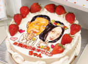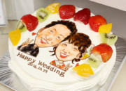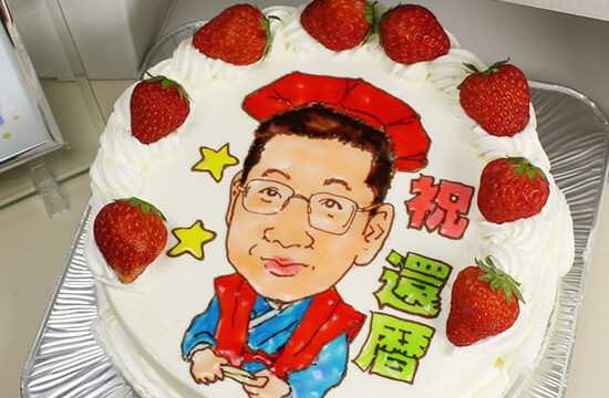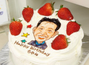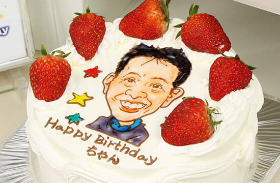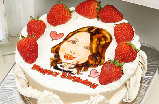 似顔絵は描く人の個性が出ます。コンチェルトの似顔絵ケーキはプロの似顔絵デザイナーが描いています。その特徴を捉えたちょっとユーモラスな似顔絵は、みんなの前で箱から出した瞬間の盛り上がりと、写メの嵐は幹事さんにとって、最高の瞬間ですね。